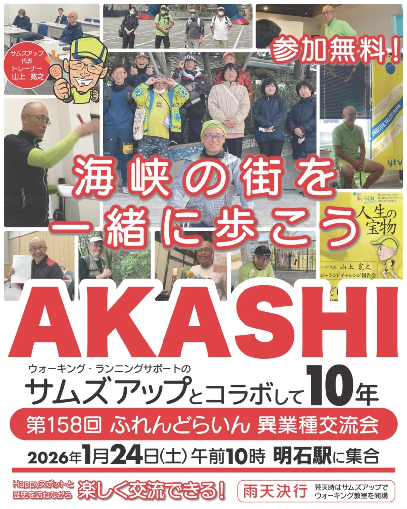 2026.01.04 イベント エンパワーウォーキング ふれんどらいんコラボ 明石周辺走快ウォーキング&ランニング百景 ふれんどらいんコラボウォーキング参加者募集~明石材木町エリア いつもお世話になっている「ふれんどらいん交流会」とのコラボ企画 参加者募集中! 開催日:2026年1月24日(土) 集合時間:午前10時 集合場所:JR神戸線・山陽電車 明石駅 ポン太前集合 開催形態:ウォーキング交流会(雨天決行) 参加費:無料 定員:状況により調整(事前申込制) *受付はふれんどらいんホームページにて